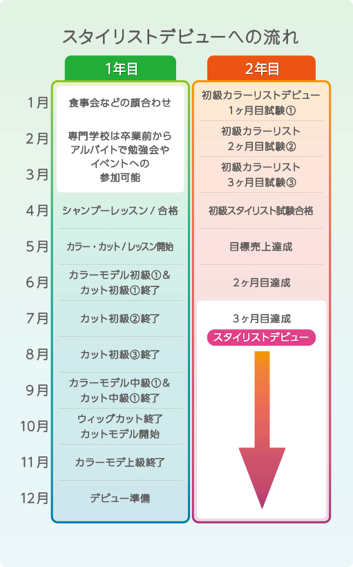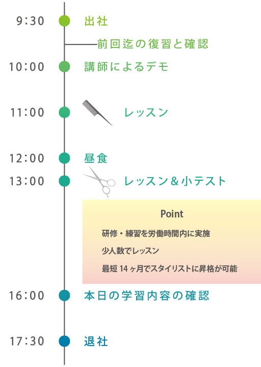 中間生アシスタントは各個人のスキルに合わせたカリキュラムを受講して早期のスタイリストデビューを目指します。