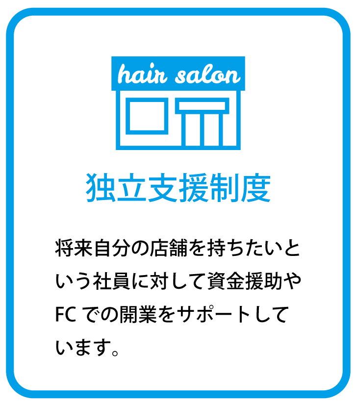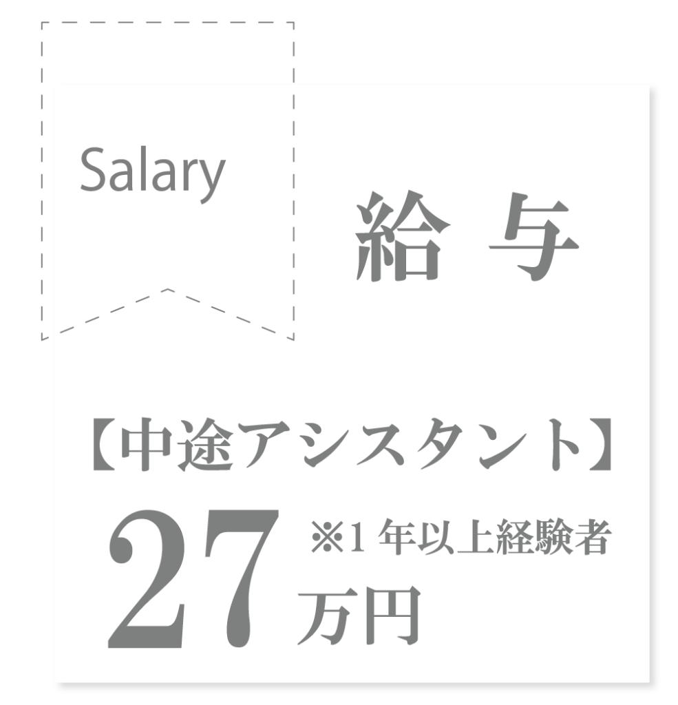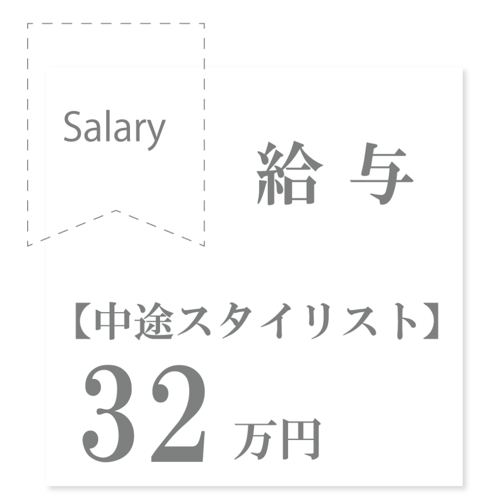 | 給 与 | 中途スタイリスト 32万円 中途アシスタント(実務経験1年以上) 27万円 新卒アシスタント 21万円 +売上げ歩合(技術歩合・店販歩合・報奨金) |
