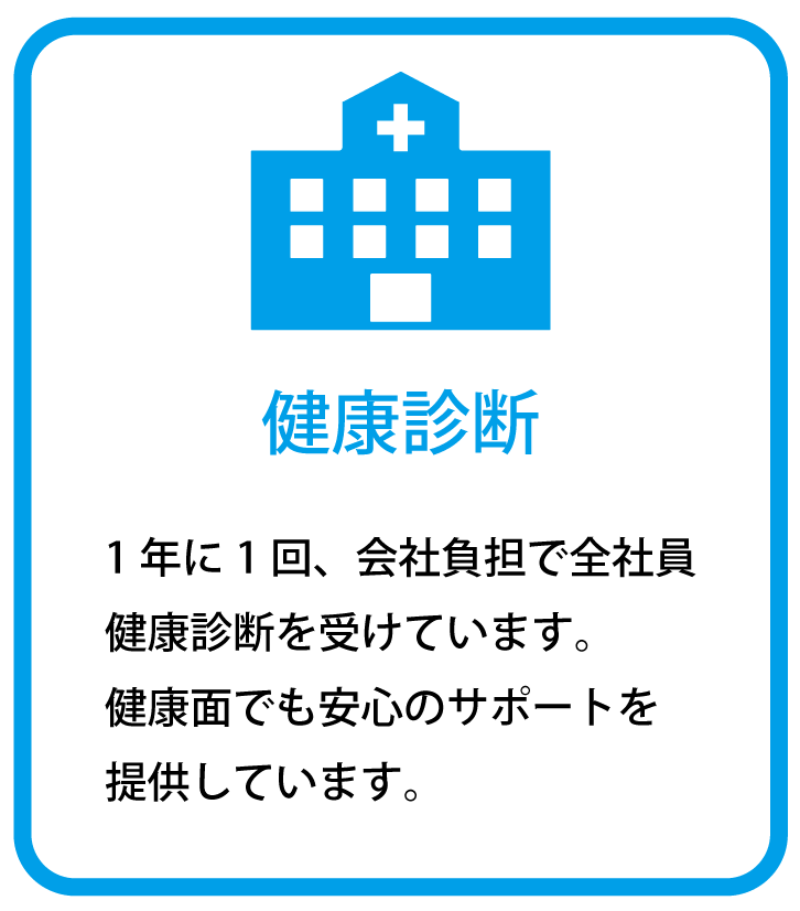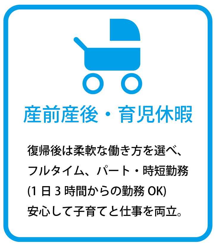 年1回の健康診断は会社負担で健康管理もバッチリ。産休・育休制度もしっかりしており、制度利用の9割が現場復帰しています。