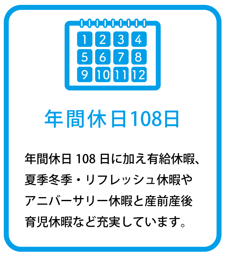 週休2日で有給休暇も取りやすく、リフレッシュ休暇やAnniversary休暇など休暇も充実しています。