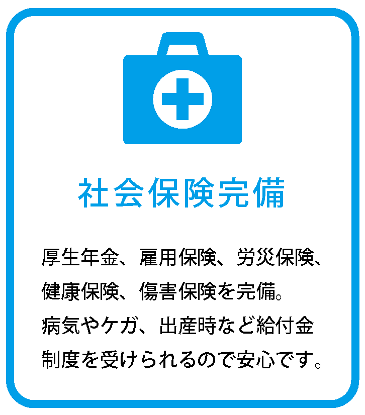 社会保険にしっかり加入していますので「もしも」の時にも安心。